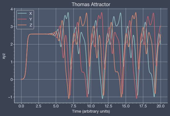What may not be apparent from the above graphics is that the images are in three dimensions. The Thomas attractor, for example, use the dimension x, y, and z. The values of the attractor in each of the three dimensions can be plotted as separate line plots.