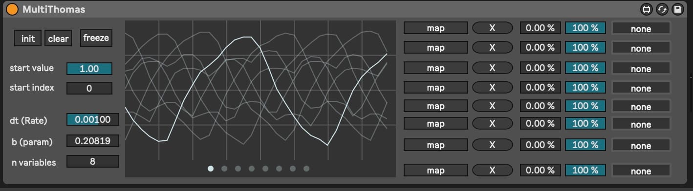 This is my first attempt at distributing a M4L device, so I cannot guarantee the relative usefulness of this device. The main limitation I see is that because this uses a chaotic oscillator, it is extremely difficult to ensure that the simulation happens the same on every playback if playback (or rendering) happens in the middle. Also, the attractor may need to be reinitialized at the beginning of a Live set using parameter automation.